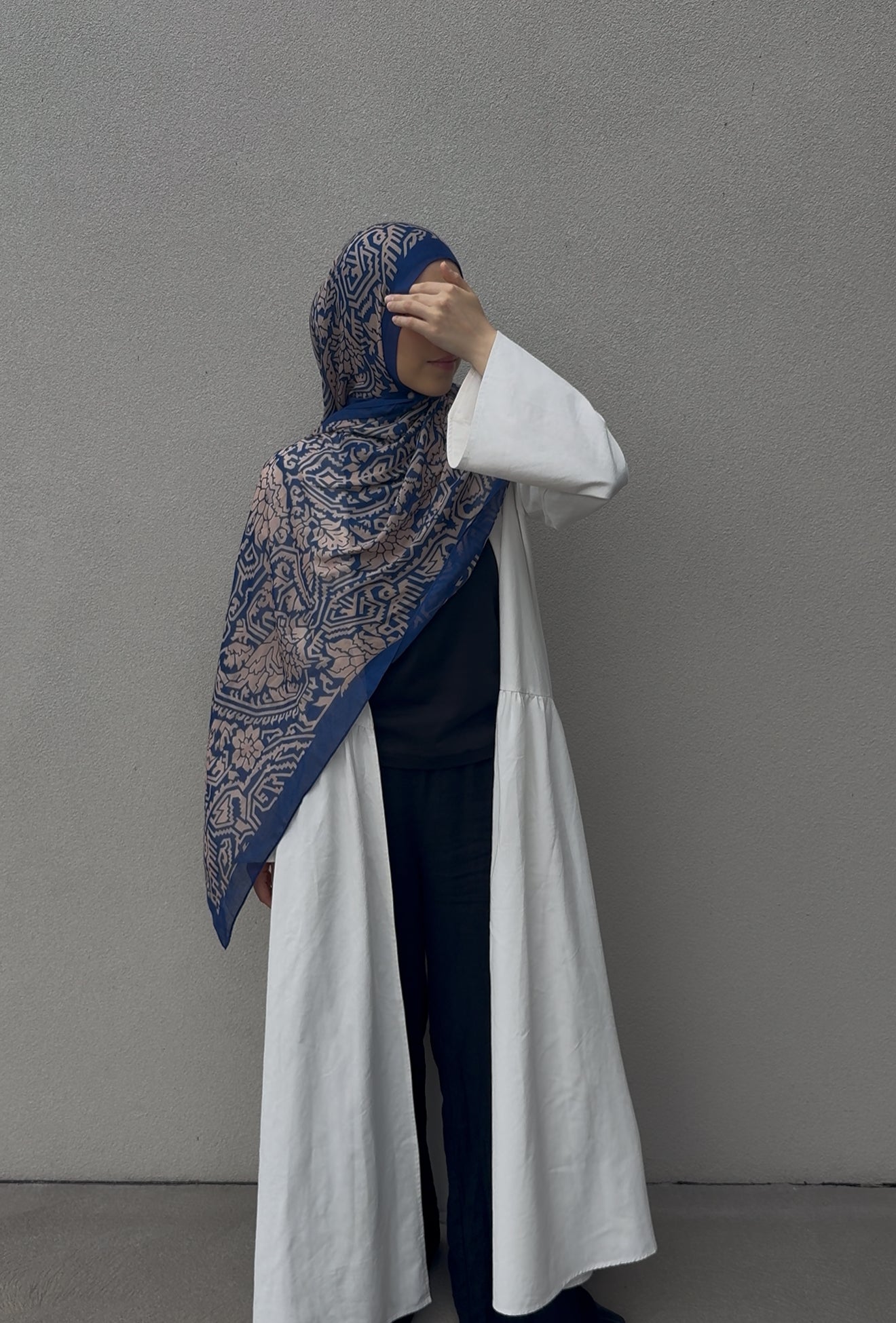 This hijab features an intricate geometric pattern in deep navy and soft beige tones, creating a striking yet timeless contrast. Lightweight with a fluid drape, it offers effortless elegance and comfort for all-day wear.