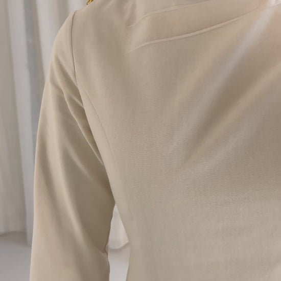Thoughtfully tailored, the dress features a subtle flare at the sleeves adding a structure and definition, while the neckline showcases intricate pleated detailing accented with a delicate gold button. The tie-backs at the back allow you to adjust the fit to your preference.
