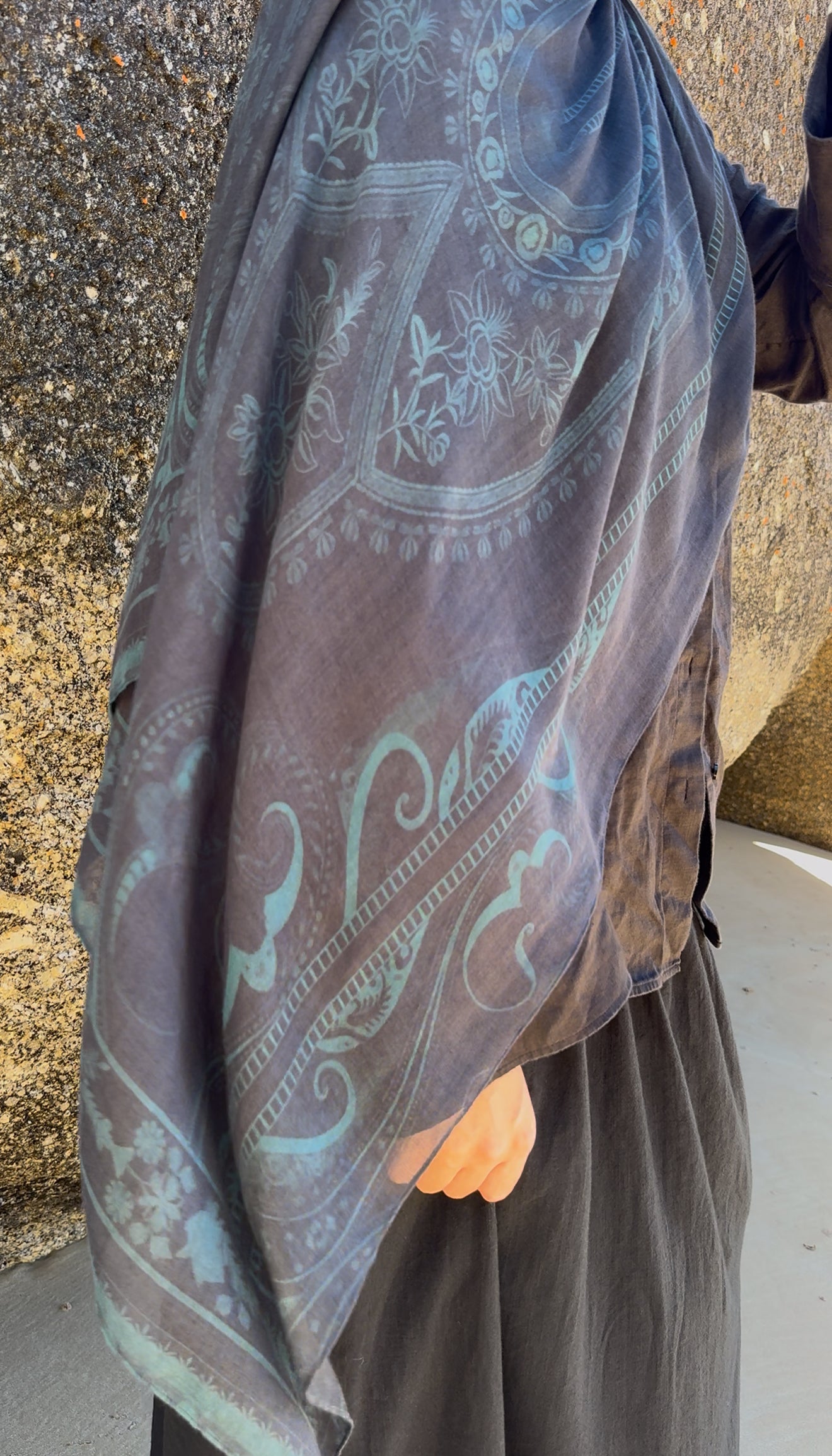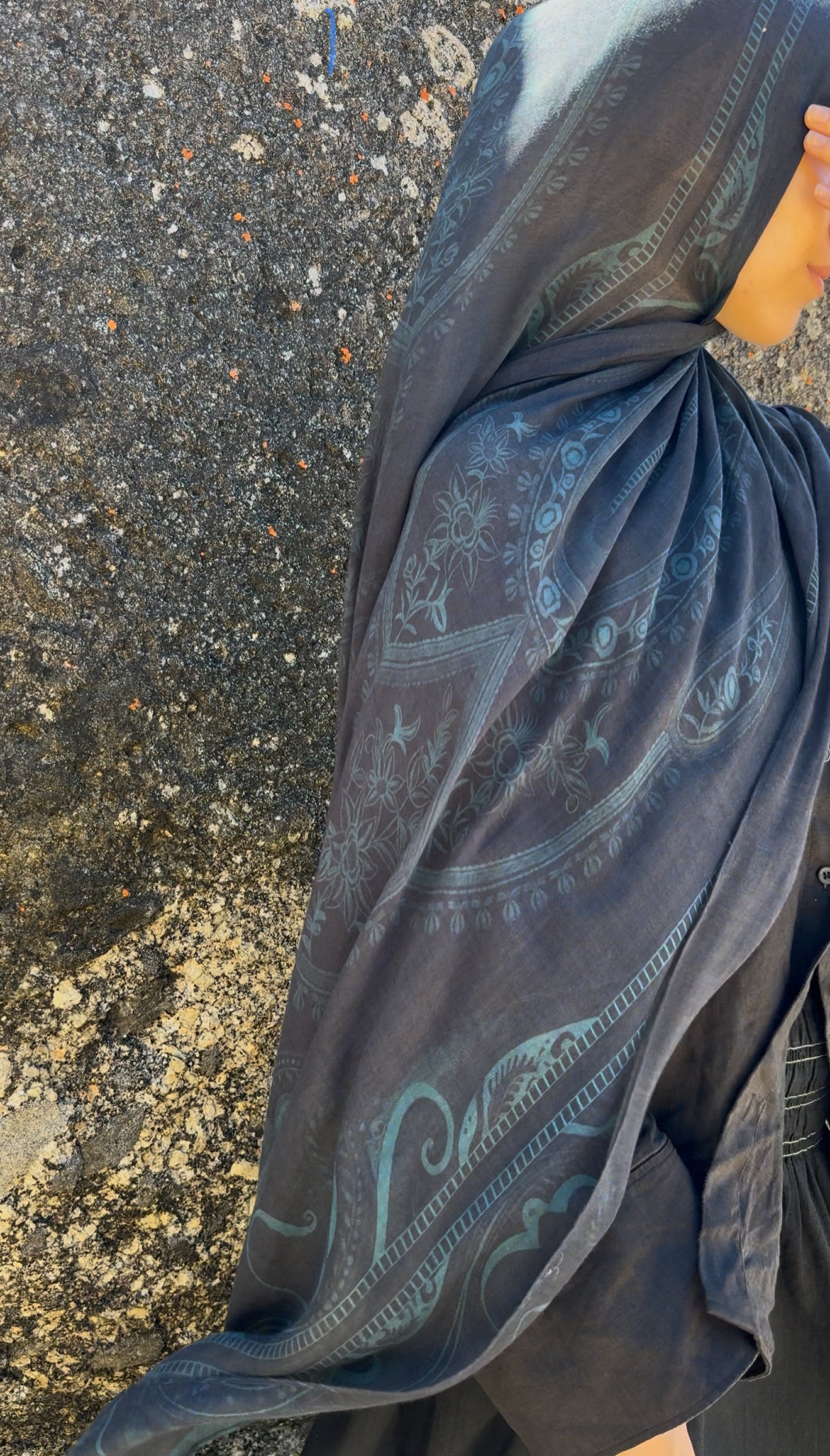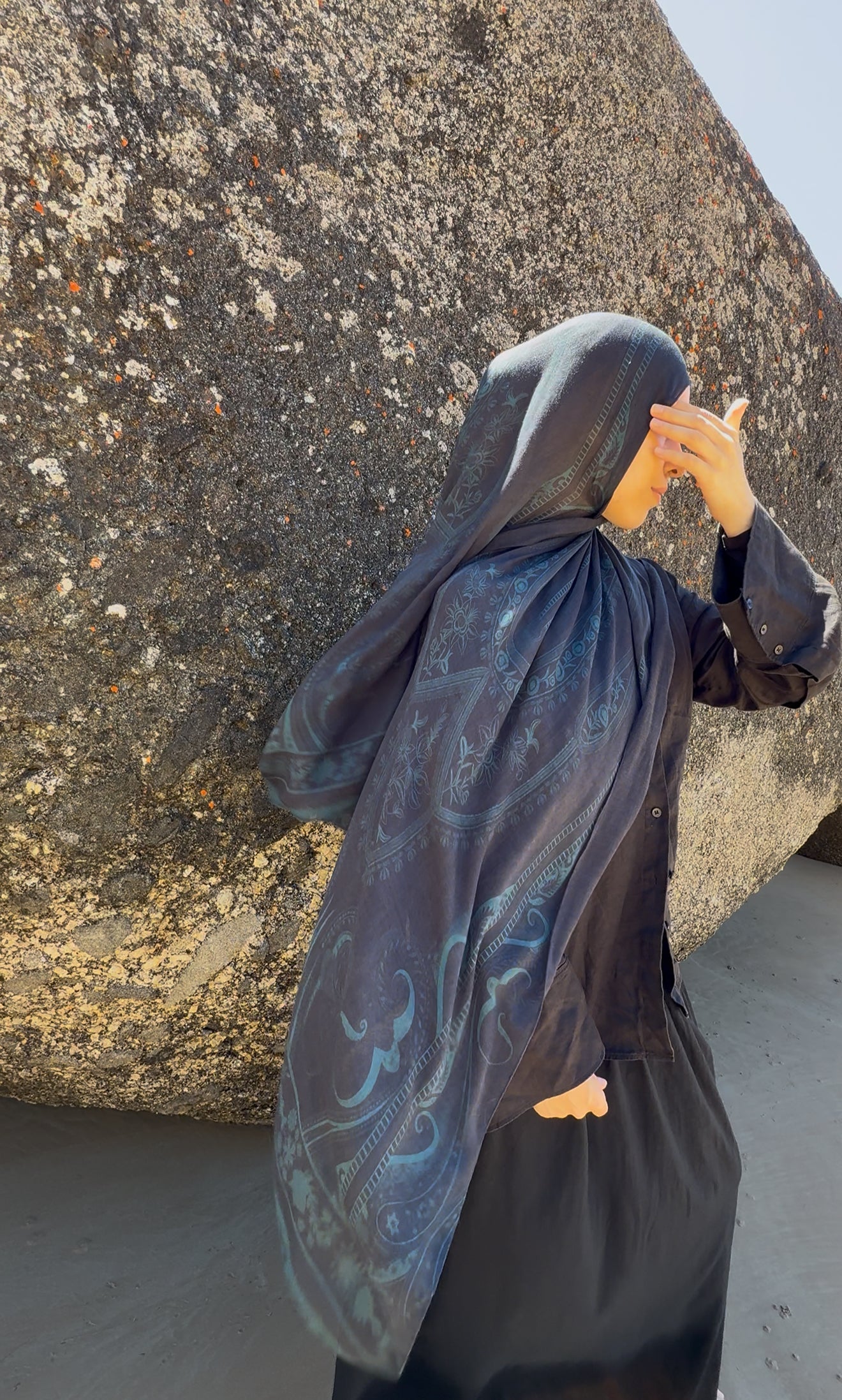 This hijab features an intricate paisley design in deep charcoal and muted teal tones, creating a rich and understated contrast. Crafted in a lightweight fabric with a soft, fluid drape, it falls effortlessly for an elegant finish.